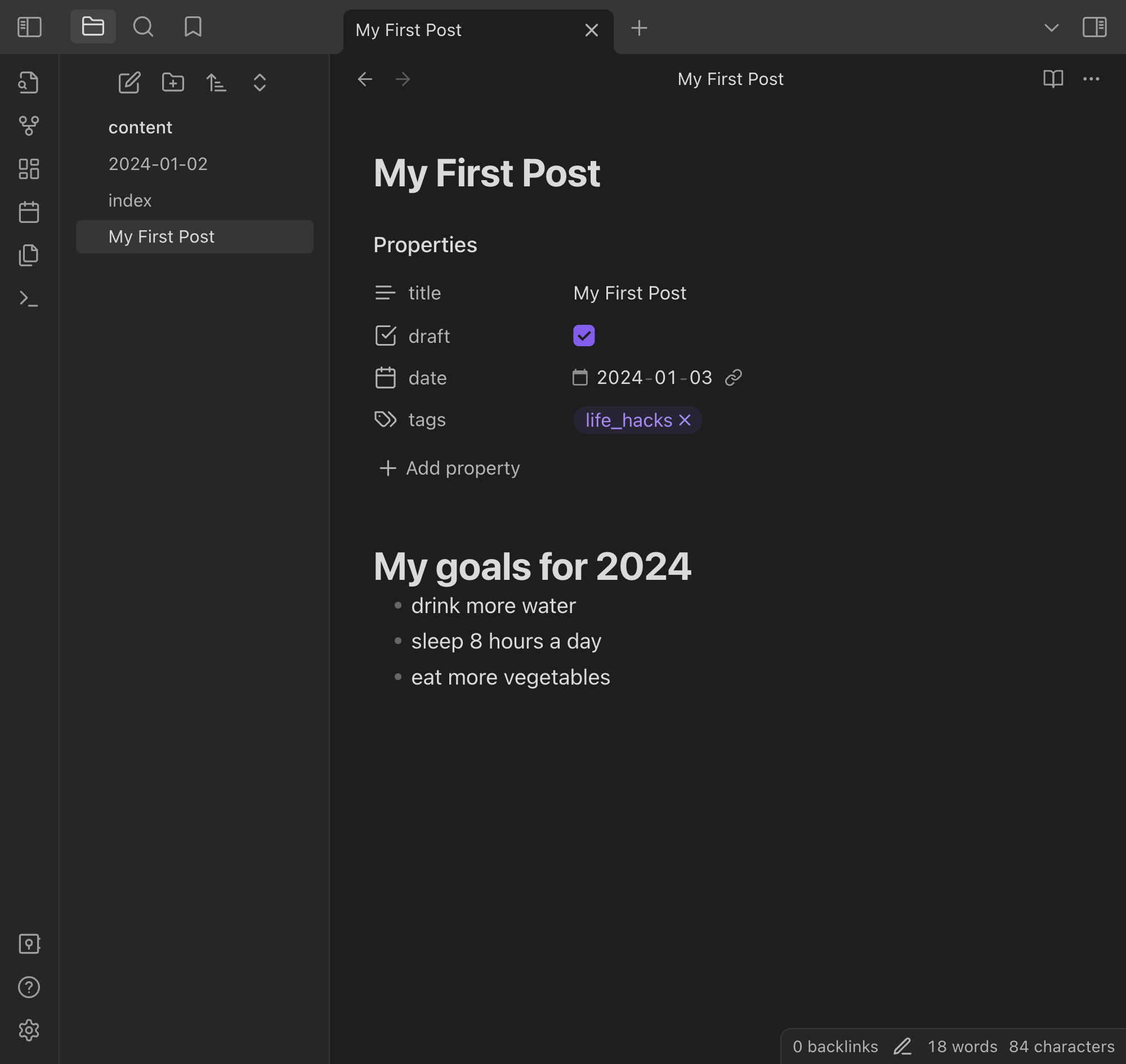 we can create a new note and give it a name. Then we need to create properties in the note by adding --- which adds a properties panel and then we can use markdown to create our first document.