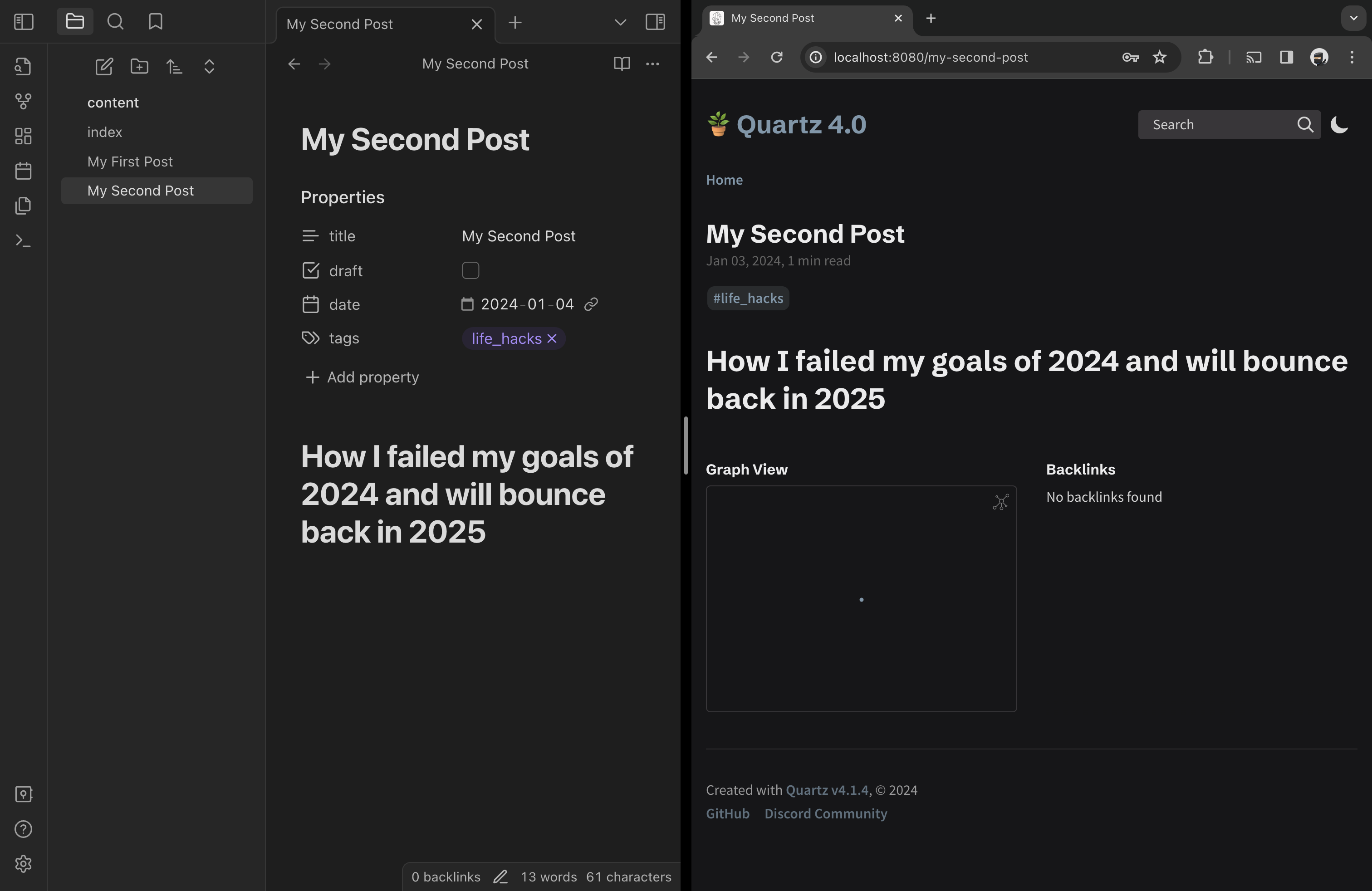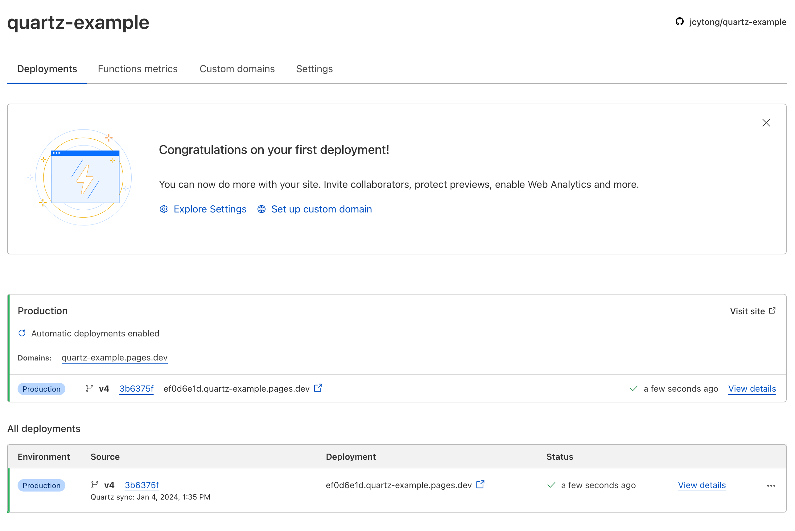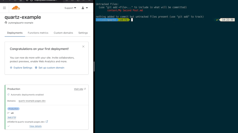 npx quartz syncThis commits to the GitHub repo and a build is kicked off on Cloudflare. Within seconds, the second post is live 🎉